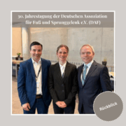 Vom 8. bis 10. Mai 2025 fand in München die 30. Jahrestagung der Deutschen Assoziation für Fuß und Sprunggelenk e.V. (DAF) statt. Unter dem Motto „Evidenzbasiert – Interdisziplinär“ kamen führende Spezialistinnen und Spezialisten zusammen, um neueste Entwicklungen und innovative Behandlungsmethoden im Bereich der Fuß- und Sprunggelenkchirurgie zu diskutieren.